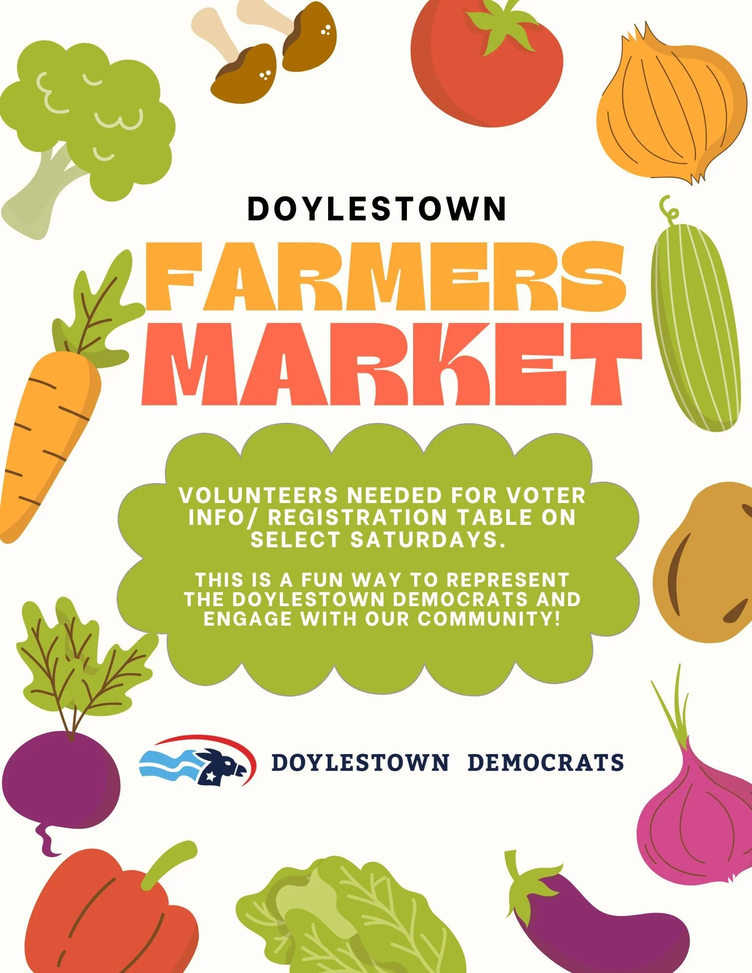 Farmer's Market Membership Information Table Saturday, April 25, 2026 8:00 AM 1:00 PM 08:00 13:00 Google Calendar ICS Interested in helping the Doylestown Democrats at the Farmer’s Market information table? Click here to sign up!